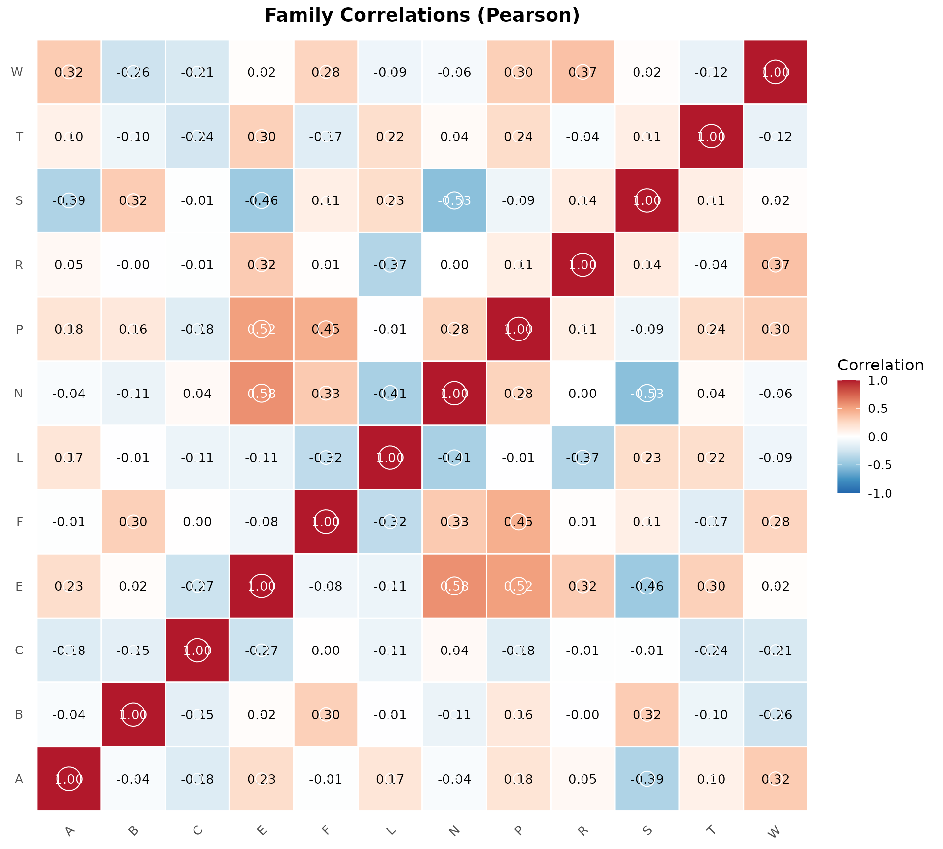 - Visualisation : Radars 12-axes, cartes multi-familles, matrices de corrélation