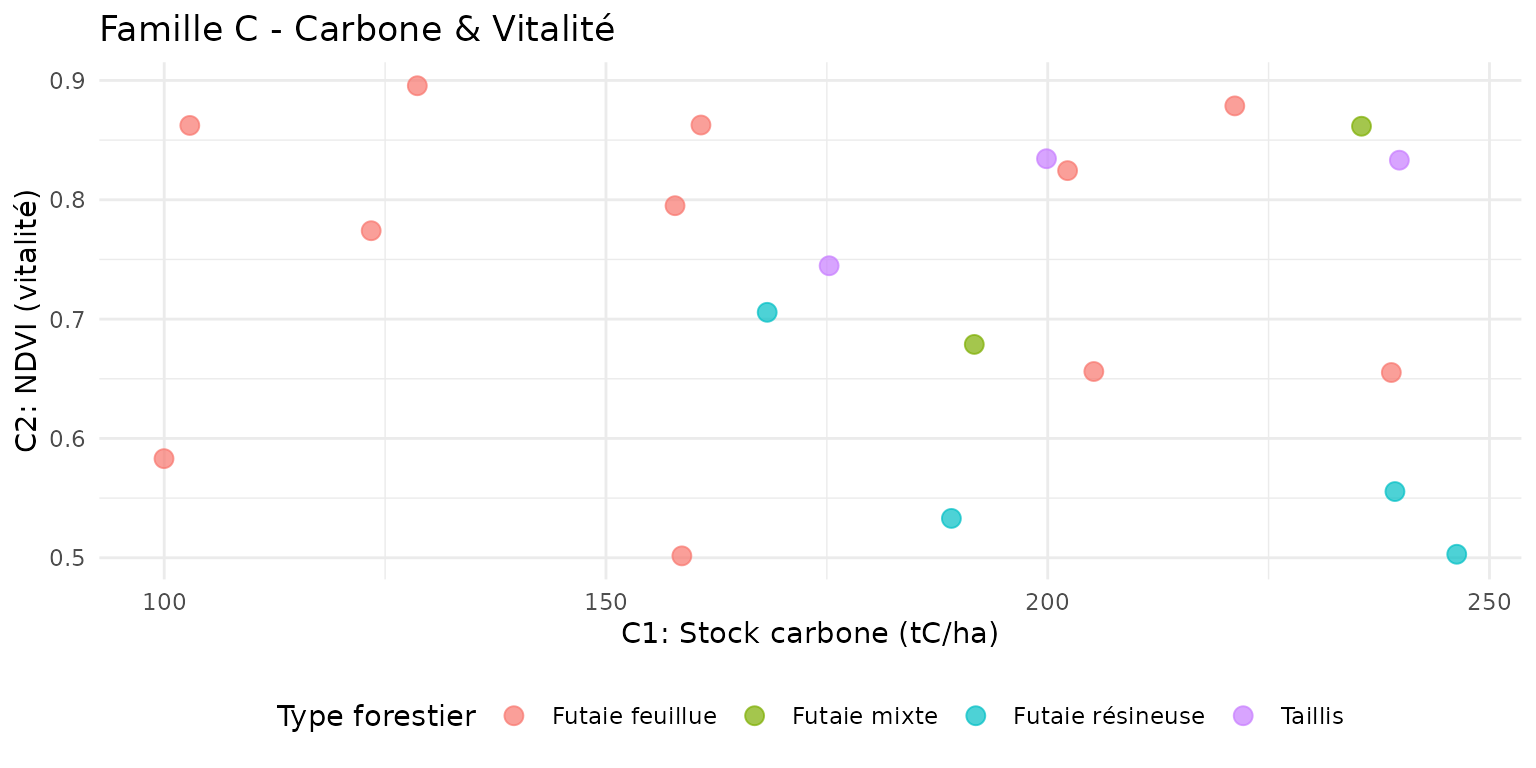 | C | Carbone & Vitalité | Stock carbone et santé végétation | 2 |